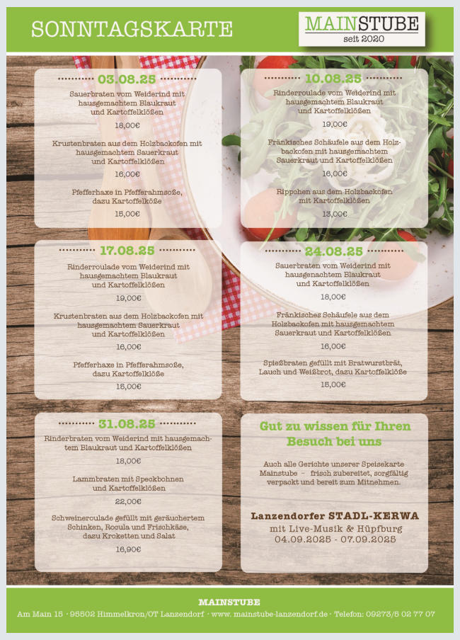 Unsere Speisekarte für Sonntags. Für euch zum abholen oder bei uns zu speisen. NEU: Immer zum Wochenende selbst- gebackenes Holzofenbrot (bitte vorbestellen). Unser Wirtshaus ist Sonntags von 11:30 bis 14:00 Uhr geöffnet. Bestellungen und Reservierungen unter: 09273/5 02 77 07.
